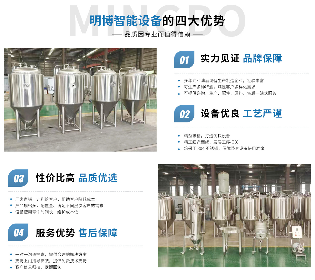 安徽明博智能設(shè)備有限公司位于安徽省宿州市宿馬園區(qū)馬鋼機械園2號廠房;我司擁有制造多年不銹鋼設(shè)備行業(yè)經(jīng)驗,主推生產(chǎn)大中小型精釀啤酒設(shè)備、果酒設(shè)備、啤酒實驗設(shè)備、和提供釀酒技術(shù)支持的生產(chǎn)廠家。 公司經(jīng)營范圍具體包含:食品、酒、飲料及茶生產(chǎn)專用設(shè)備制造;日用化工專用設(shè)備制造;制藥專用設(shè)備制造;環(huán)境保護專用設(shè)備制造;智能基礎(chǔ)制造裝備制造;金屬結(jié)構(gòu)制造;制冷、空調(diào)設(shè)備制造;氣體壓縮機械制造銷售等;我們是集設(shè)...